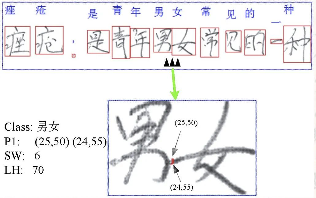 CASIA-HWDB-T:一个从中文手写数据库CASIA-HWDB收集的触摸字符数据库。所有接触的字符(或字符串)都用字符类别、接触点的位置以及字符串高度(LH)和平均笔划宽度(SW)等辅助值进行注释。