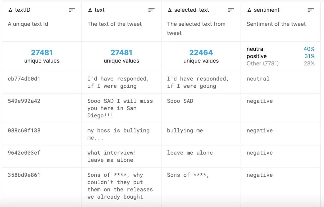 每行包含一条推文的文本和一个情绪标签。在训练集中,您将获得一个从推文 (selected_text) 中提取的单词或短语,它封装了所提供的情绪。