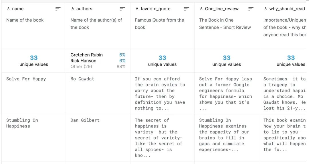 自 2005 年以来,整体幸福感正在下降,而悲伤和愤怒等负面情绪却在上升。更糟糕的是,越来越多的年轻人患有精神疾病、成瘾及其后果。本数据集收集了排名前33名的关于幸福的书籍、评论和引用。