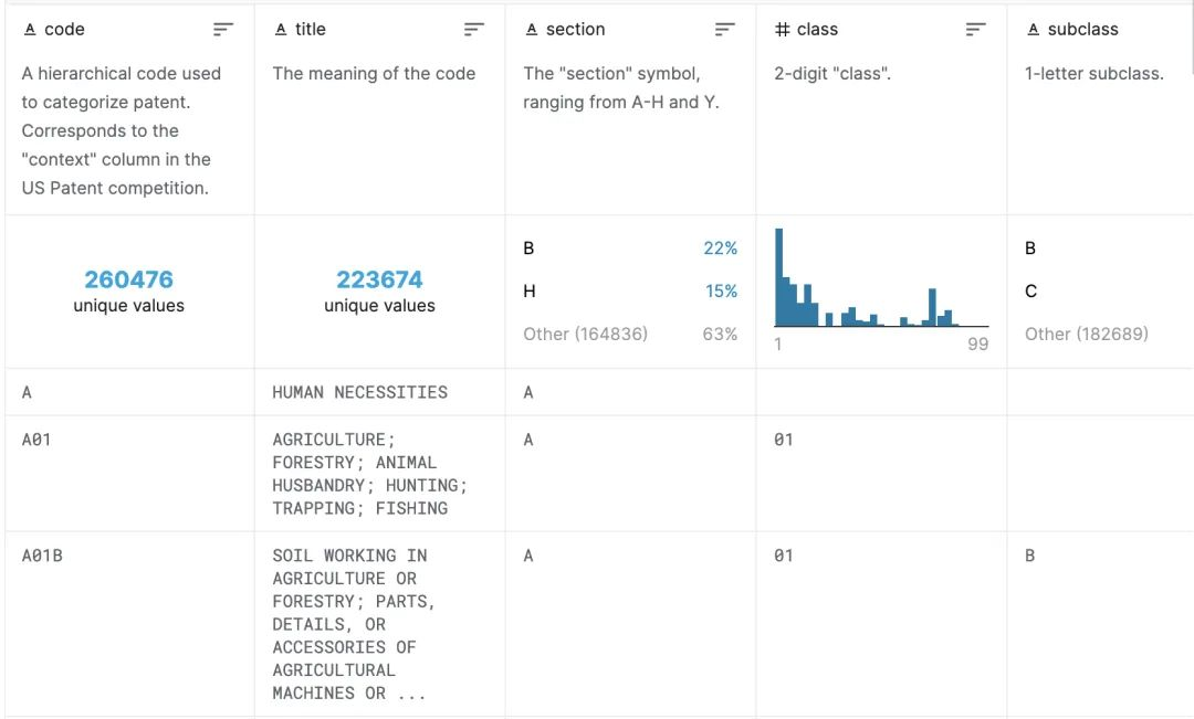 该数据集是为美国专利短语匹配竞赛提供的。它通过提供context列中每个代码的含义来添加附加信息。