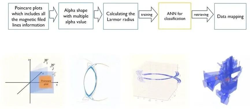 第二项工作即LHD型螺旋聚变反应堆中等离子体形状的可视化(Visualizationof Plasma Shape in the LHD-Type Helical Fusion Reactor),该研究被应用于研究核聚变反应堆与等离子体区域之间的关系。Koyamada教授团队提出的方法将磁导线通过注释工具转化为注释的点数据,点数据在横截面中的交点数据经过神经网络模型建模得到对应的Confine体数据以及Ergodic体数据,并基于两类数据构建等离子体区域数据。等离子体区域数据与聚变反应堆数据映射出等离子体形状的三维可视化,流程如图3所示。该研究使用自动微分法(Automatic Differentiation)对指定的函数导数进行估值。