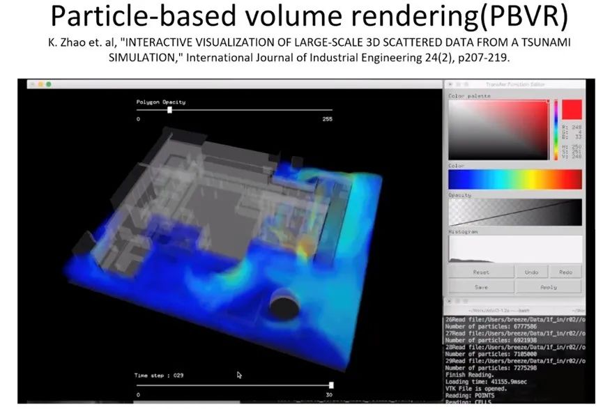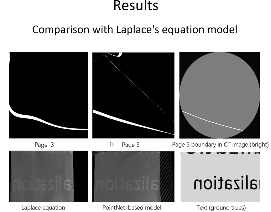 Koyamada教授带来了题为《Visual Analysis to Support the Derivation andSolution of PDEs UsingNeural Networks》(基于神经网络的偏微分方程求解过程的可视分析)的精彩报告。报告开始前,Koyamada教授祝愿北京2022年冬奥会顺利举行,并回忆了自己与中国可视化社区的合作交流,包括2019年在成都举行的ChinaVis大会。Koyamada教授从三个主题剖析了科学可视化研究与AI的关系,其一是AI-ehanced Visualization(AI4VIS),其二是Surrogate Model(代理模型),其三是Visualization-enhanced AI(VIS4AI)。Koyamada教授首先介绍了神经网络模型可视化的三种方法:第一种是规则网格的生成;第二种是基于粒子的体绘制,如图1所示;第三种在没有网格的基础上对神经网络模型实现光线追踪。针对上述神经网络模型可视化,Koyamada教授引入了第一个主题AI-ehanced Visualization,并介绍了团队在该领域的相关研究进展。第一项工作即3D书籍数据页面的切割与提取,该研究能实现对CT扫描的古籍页面信息进行数字化提取。Koyamada教授团队提出的方法将3D图片数据通过注释工具转化为点云数据并由神经网络模型生成页面体数据,最终经过等值提取映射出古籍页面信息,如图2所示。