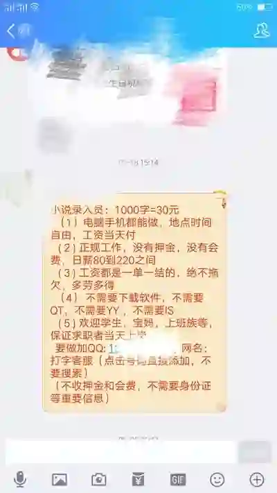 下面这张图片中的小广告充斥在我们所加入的一些QQ群、微信群当中,也有一些分类信息网站、兼职网站上都会有这种兼职信息;虽然这已经是烂大街的手段,但依然还是会有人上当受骗。