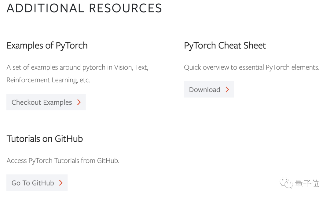 具体的PyTorch示例、PyTorch中常用API、元素的备忘录,以及教程的GitHub链接,则作为附加资源,单独列在教程板块之后,很容易找到。