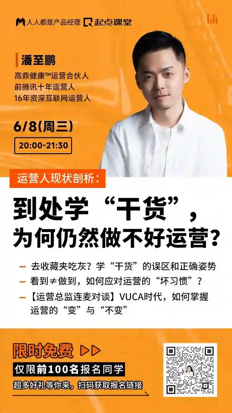 潘至鹏老师将和起点课堂运营总监李黎江老师一起探讨这些问题,让你也能理解并抓住运营的核心本质,给到你更实在的行动建议。