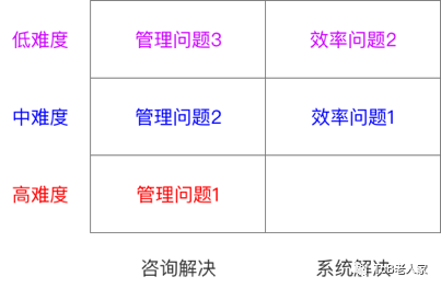 比如,管理问题1的解决方案属于咨询解决和高难度方案,管理问题2的解决方案则属于咨询解决和中难度方案,效率问题1则属于系统解决和中难度方案。