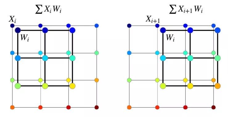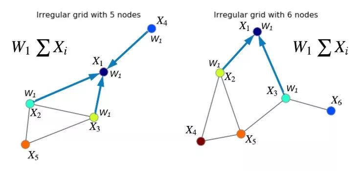 当我们进行卷积的时候,要从两个方向滑动这个滤波器:向右和向下,可以从底角开始,重要的是要滑过所有可能的位置。在每个位置,计算网格上值之间的点积(表示为X)和滤波器的值W:X₁W₁+X₂W₂+…+X₉W₉,并将结果存储在输出图像中。在我们的可视化过程中,改变节点在滑动过程中的颜色,以匹配网格中节点的颜色。在常规网格中,我们始终将滤波器的节点与网格的节点相匹配。但这并不适用于图,我将在下面进行解释。