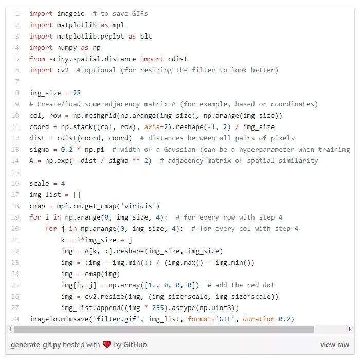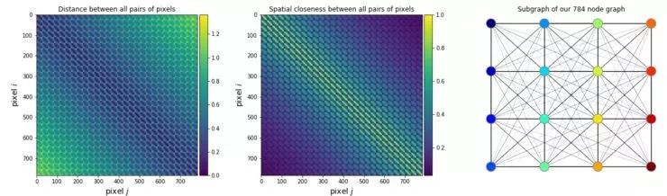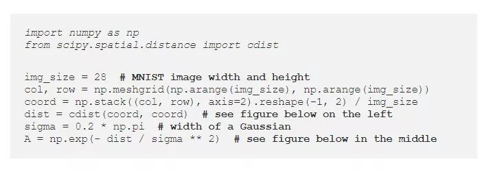 现在,让我们根据像素的坐标为我们的MNIST示例创建一个邻接矩阵A(文章末尾提供了完整的代码):