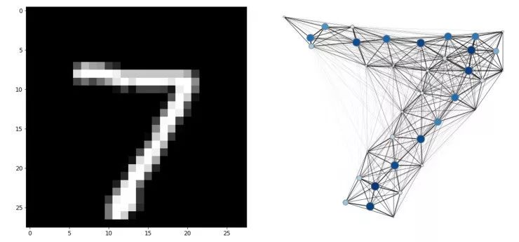 图5:左侧是MNIST数据集的图像,右侧是图的示范。右侧较暗和较大的节点对应较高的像素强度。右图的灵感来自图6(Fey等人,CVPR,2018)