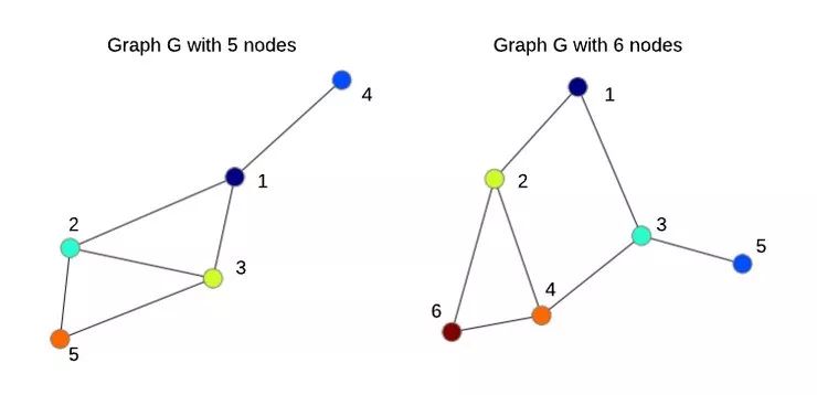 图2:两个分别有5和6个节点的无向图,节点的顺序是任意的。
