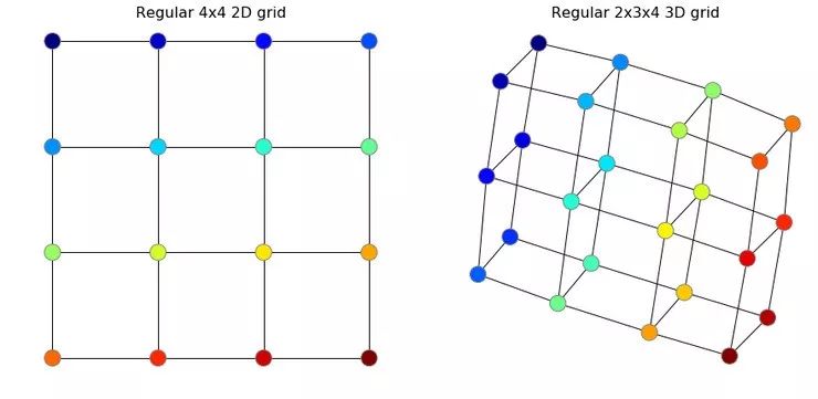 当我们在图像上训练神经网络或Convnet时,潜意识里我们在图上就已经将图像定义成了一个规则的2D网格,如下图所示。这个网格对于所有的训练和测试图像是相同且规则的,也就是说,网格的所有像素都以完全相同的方式在所有图像之间连接(即具有相同的连接数、边缘长度等),所以这个规则的网格图没办法帮我们从一幅图像中分辨出另一幅图像。下面我可视化了一些2D和3D规则网格,其中节点的顺序是彩色编码的。顺便说一句,我是在Python代码中使用了NetworkX来实现的,例如G=networkx.Grid_Graph([4,4])。