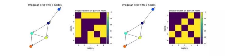 让我们先来考虑一个简单的情况,当你得到一些图。例如,这可以是5人的社交网络的一个片段(子图),节点之间的边缘表示两个人是否是朋友(或者他们中至少有一个人这样认为)。右边图中的邻接矩阵(通常表示为A)是一种以矩阵形式表示这些边的方法,便于构建我们的深度学习框架。矩阵中的黄色代表边缘,蓝色代表边缘的缺失。 图13:图及其邻接矩阵的例子。我们在这两种情况下定义的节点顺序都是随机的,而图仍然是相同的。