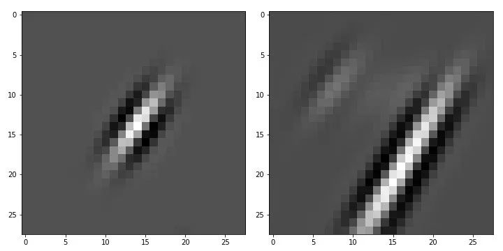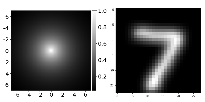 图10:一个28×28滤波器(左)和该滤波器与数字7图像的2D卷积结果。(右)