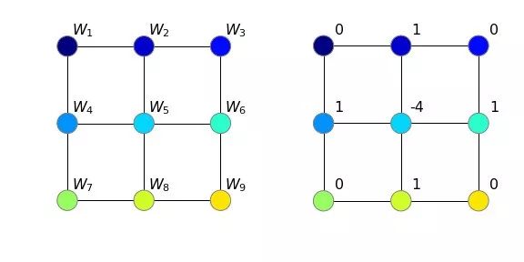 图7:在规则2D网格上的3×3滤波器的例子,左侧是任意权值w,右侧是边缘检测器。