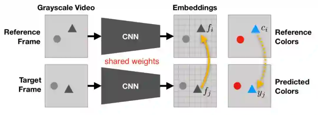 与基于图像的着色不同,此处的任务是通过利用视频帧之间颜色的自然时间一致性,将颜色从正常的参考帧复制到另一个灰度目标帧(因此,这两个帧不应相距太远)。为了一致地复制颜色,该模型旨在学习跟踪不同帧中的相关像素。