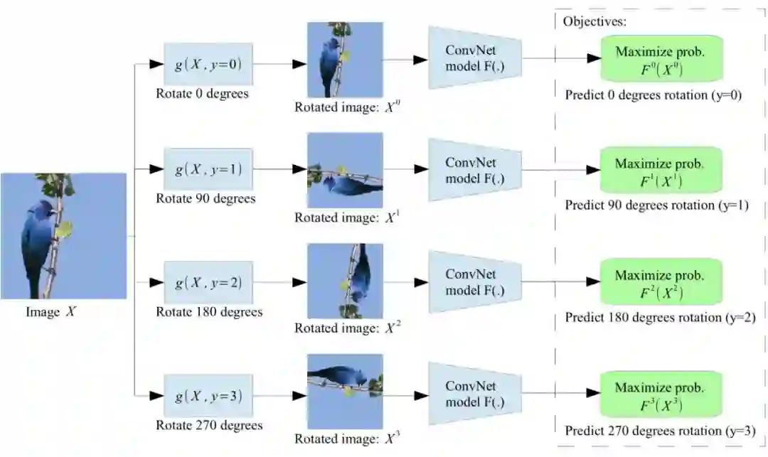 旋转整个图像是另一种有趣且低成本的方法,可在语义内容保持不变的情况下修改输入图像。每个输入图像首先随机旋转90度的倍数,分别对应于[0∘,90∘,180∘,270∘]。模型经过训练可以预测应用了哪种旋转角度,从而得出4类分类问题。