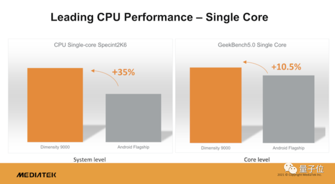 在性能方面:较现有的安卓芯片提高35%,在Geekbench5.0上单核表现提高10.5%:
