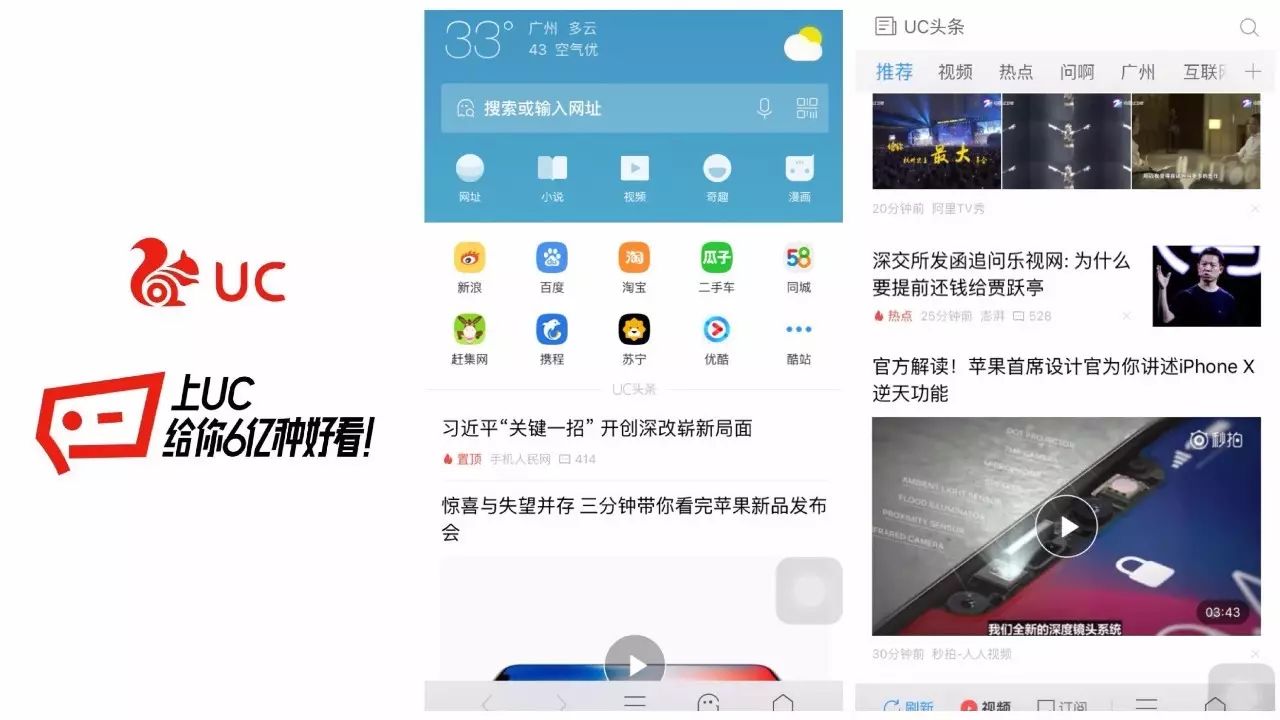 UC:最初只是一款上网的手机浏览器,优势在于用户上网速度快和省流量,作为一款信息入口工具,它在中国和印度等多个国家发展的都还不错。但从2015年开始,为了解决用户粘性和规模化的商业化变现,UC开始弱化浏览器标签,进化成为阿里布局内容分发领域的核心,打造出提供海量资讯内容的、新型大数据媒体平台,完成品牌和整体平台的转型。