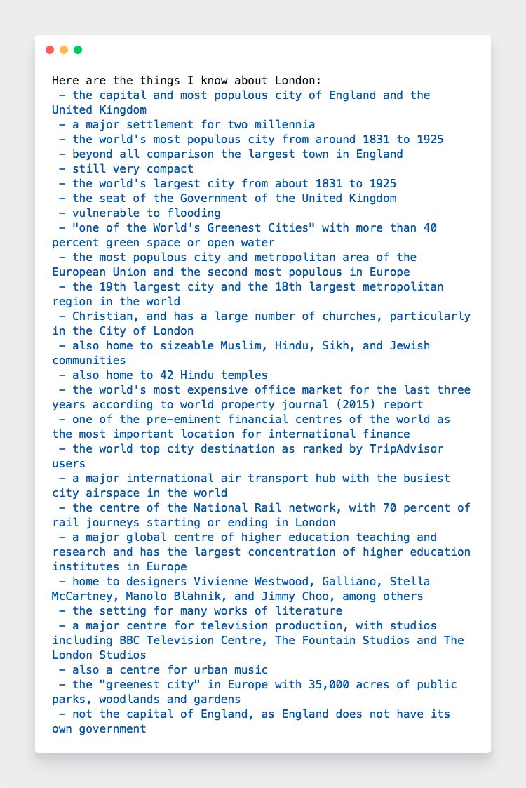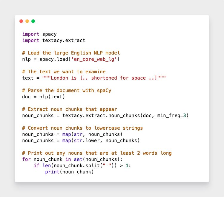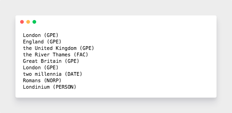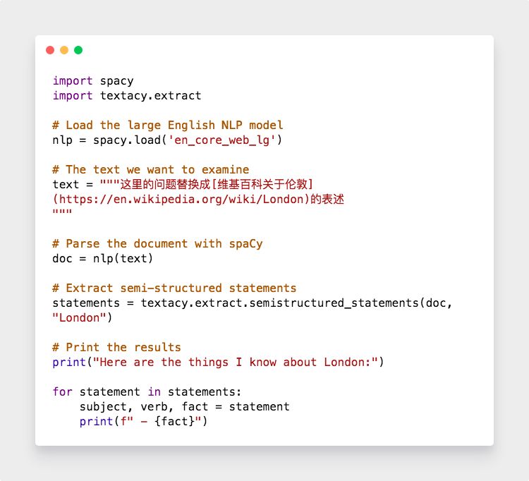 利用spaCy识别并定位的名词,然后利用textacy就可以把一整篇文章的信息都提取出来。我们在wiki上复制整篇介绍伦敦的内容到以下代码