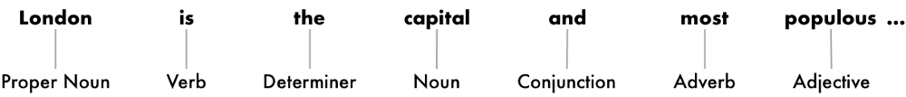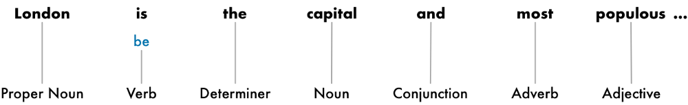 我们需要区分出一个词在句子中的角色,是名词?动词?还是介词。我们使用一个预先经过几百万英文句子训练、被调教好的词性标注(POS: Part Of Speech)分类模型: