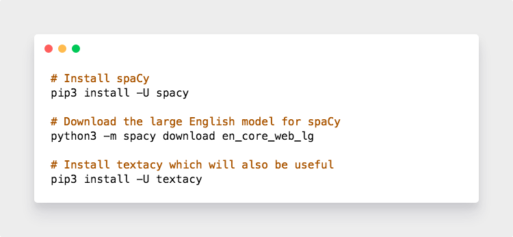 我们默认你已经安装了Python 3。如果没有的话,你知道该怎么做。接下来是安装spaCy: