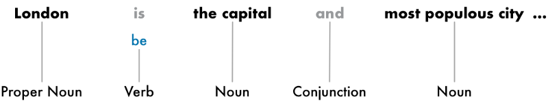 可以看到。我们等到的信息中,名词有两个,分别是伦敦和首都。伦敦是个独特的名称,首都是个通用的称谓,因此我们就可以判断,这句话很可能是在围绕伦敦这个词说事儿。
