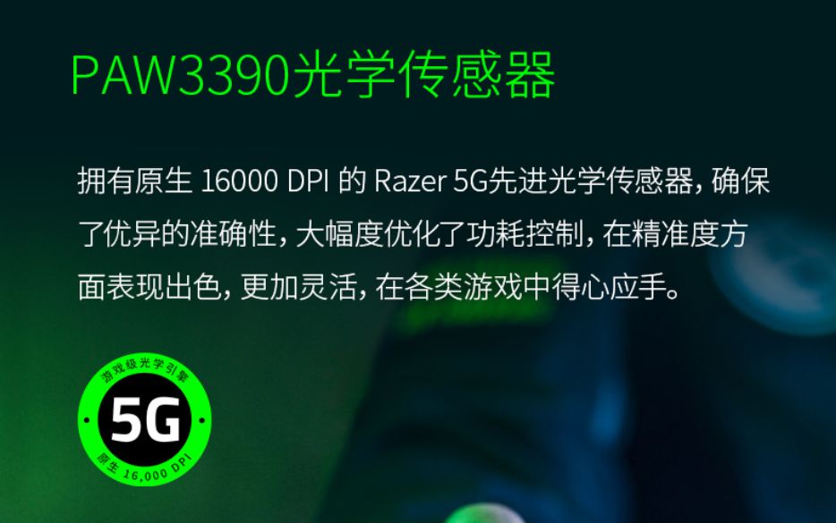 推荐理由:只有雷蛇在这个价格范围内了,传感器没有标注,从网上查询了下应该是 3325 雷蛇定制版,灯光只有绿色,但是可以调节模式,推荐这个是因为这个鼠标比 G102大一点,如果不想用小鼠的,就选它吧,价格也是比较便宜的。