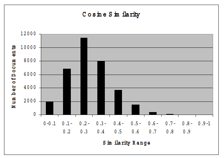 作者提出需要做Query扩展的原因是认为用户输入的Query词与实际文档集中的词存在差异,所以在传统BM25算法搜索的过程中很有可能无法命中。下图是作者做的验证工作,将文档和Query都使用词袋向量表示,向量中元素值为TF-IDF,可以看到峰值区间对应的相似度并不高。