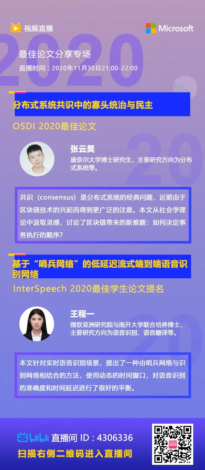 InterSpeech 2020 最佳学生论文提名一作王程一在 B 站直播间分别为大家深度解读两篇论文,欢迎大家扫码观看。