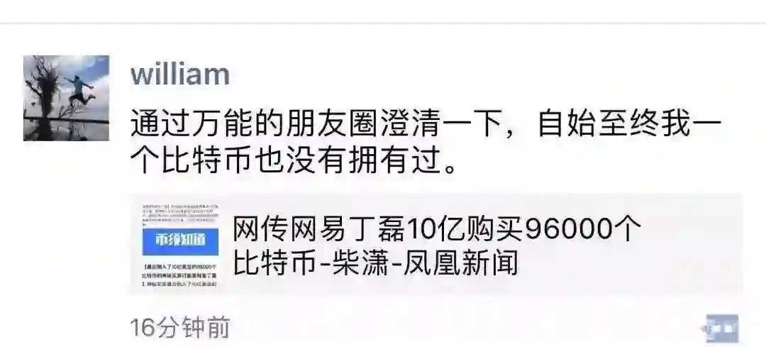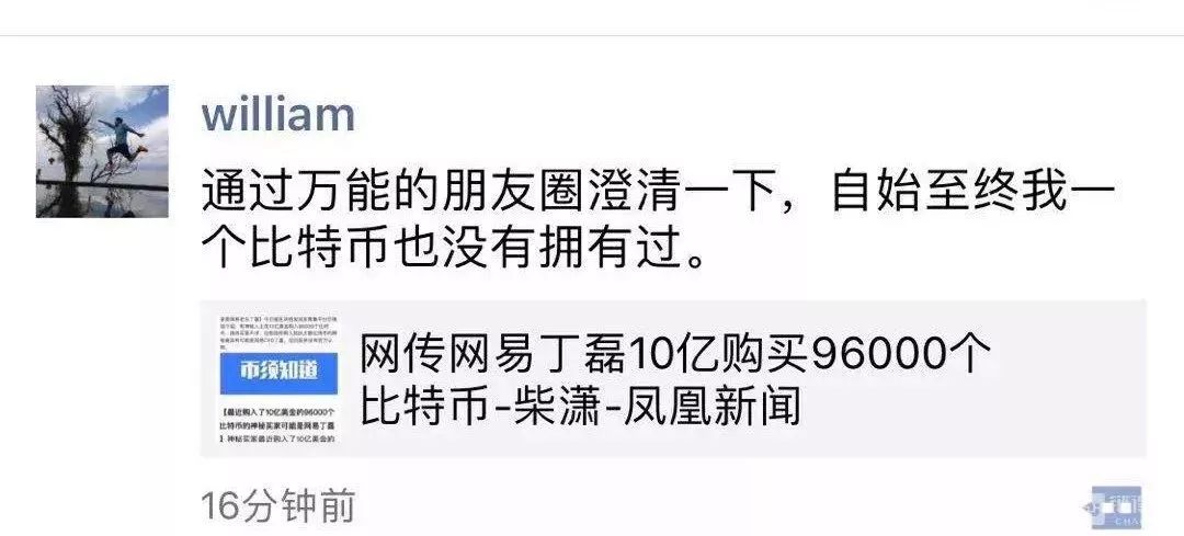 丁磊也发布微信朋友圈称,“通过万能的朋友圈澄清一下,自始至终我一个比特币也没有拥有过”。