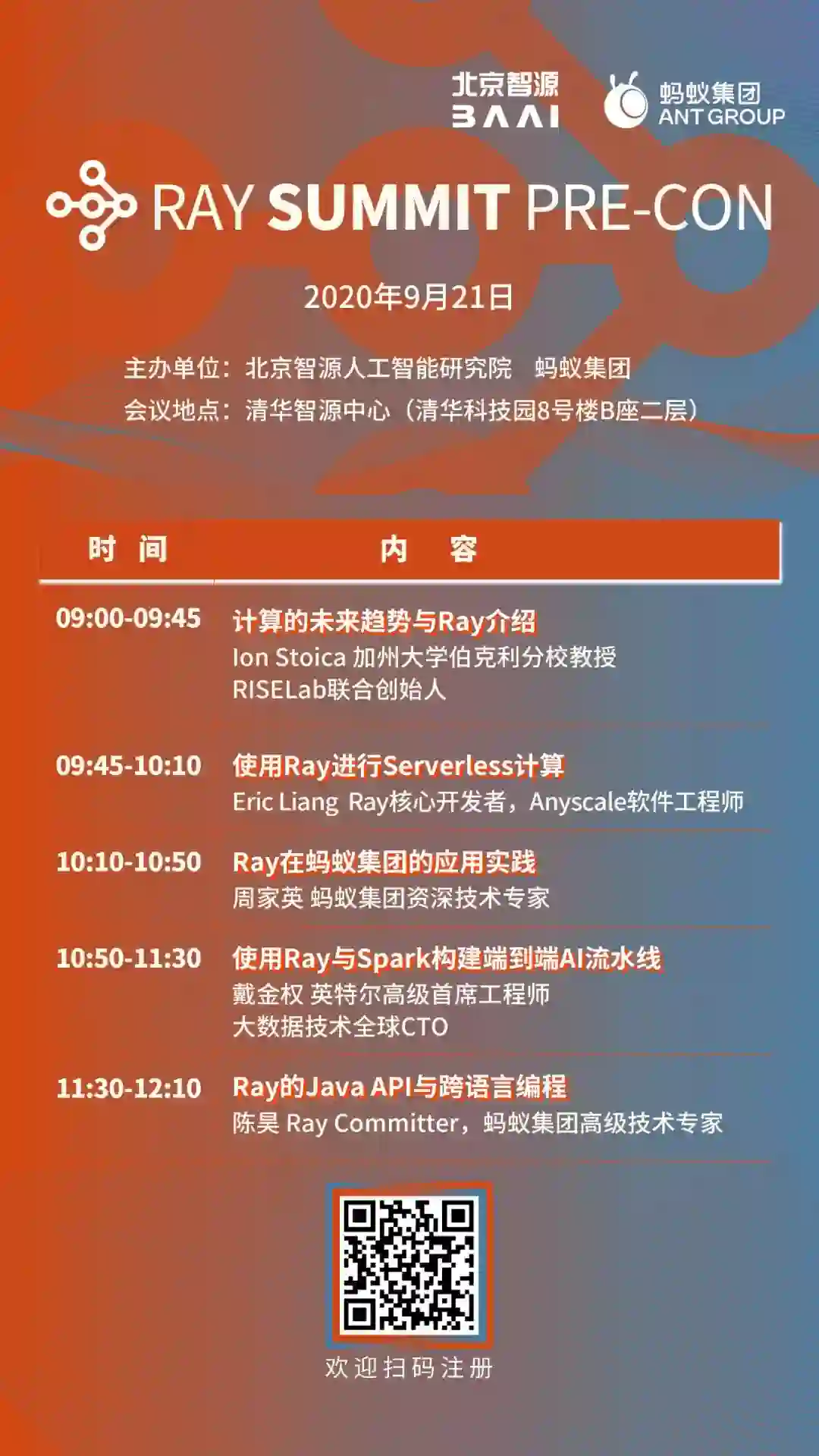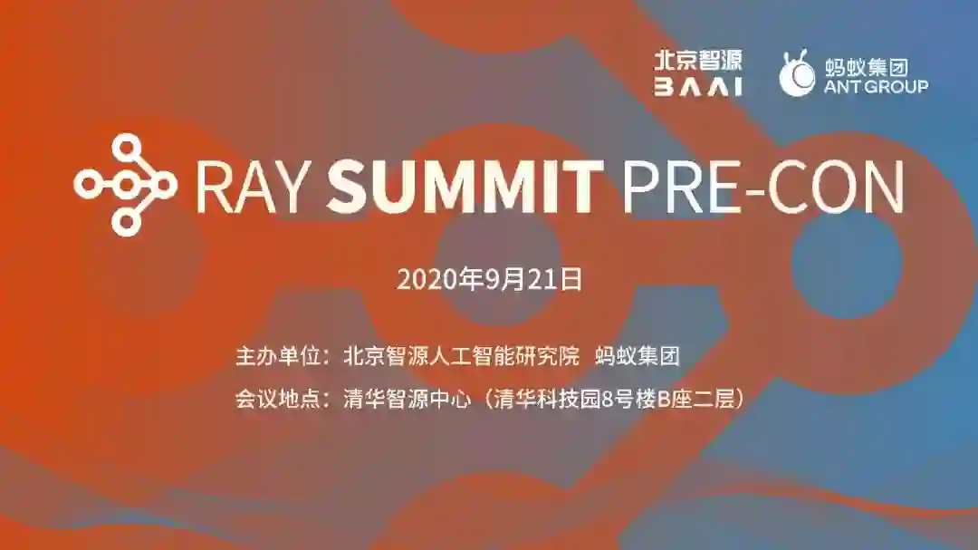由北京智源人工智能研究院、蚂蚁集团主办的「Ray Summit Pre-Con」将于2020年9月21日(周一)09:00-21:10在清华智源中心(清华科技园8号楼B座二层)举行,RISELab联合创人,Ray项目核心成员,与国内应用先行者将共聚一堂,探讨下一代计算、解析Ray的核心设计,分享在生产环境中的实际应用经验。