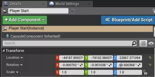 在世界大纲视图中找到 PlayerStart,设置位置如下: