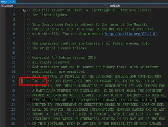 打开half.h文件,将 “AS IS” 的中文引号 修改为 ”AS IS”英文引号 保存即可。