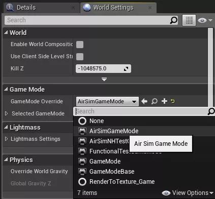然后打开 世界设置,设置 GameMode Override 为 AirSimGameMode: