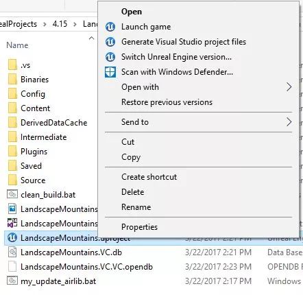 关闭Visual Studio 和 Unreal Editor,右键LandscapeMountains.uproject,选择Generate Visual Studio Project Files,会将我们刚刚复制过来的~\Plugins\AirSim和UE工程合并。
