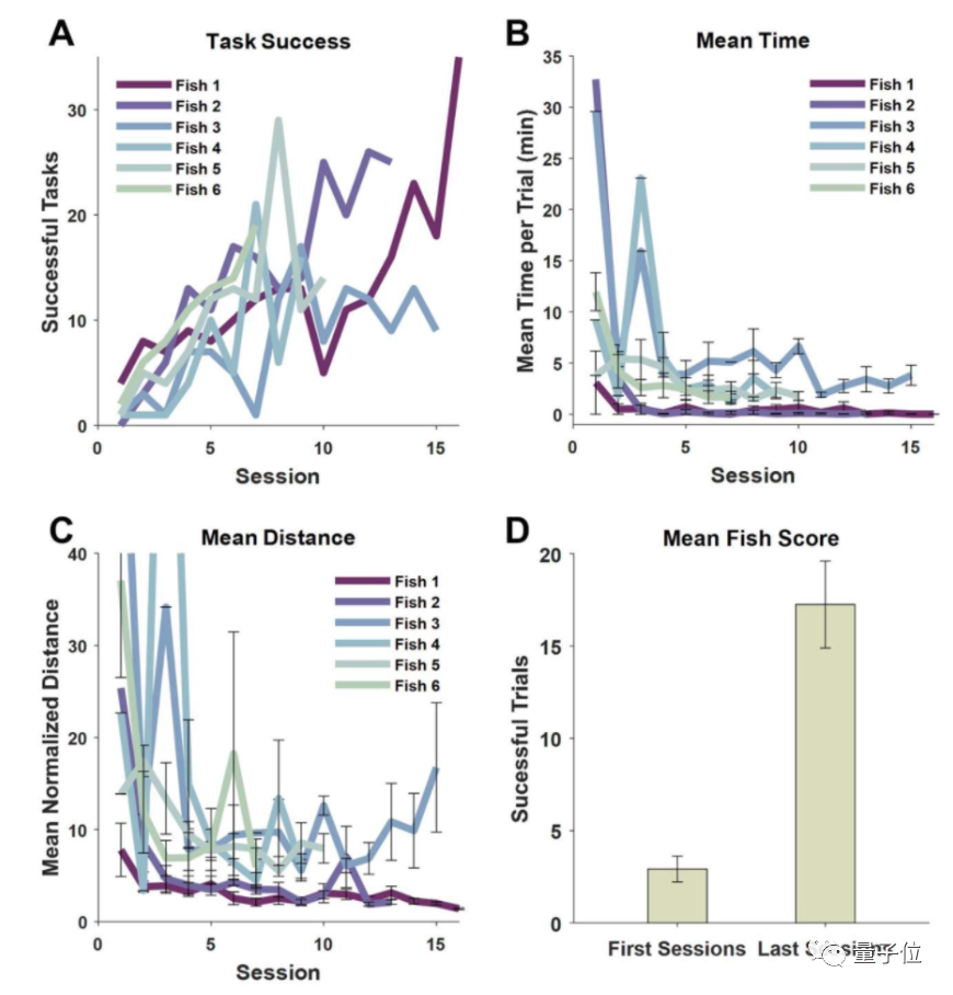 一共有6条鱼参与这次训练。从结果来看,随着次数的增多,它们在30分钟内到达目的地的成功次数变得更高,路线分数平均值也变得更高: