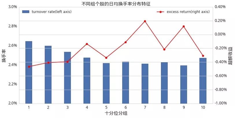 这部分我们同上部分的做法一样,分别计算了每只股票在月末的 F-SCORE 的因子值,按照因子值大小对股票排序,分为10档。然后计算每档股票的换手率的平均值,以此来反映不同的F-SCORE因子值的股票的换手率特征。结果如下图所示: