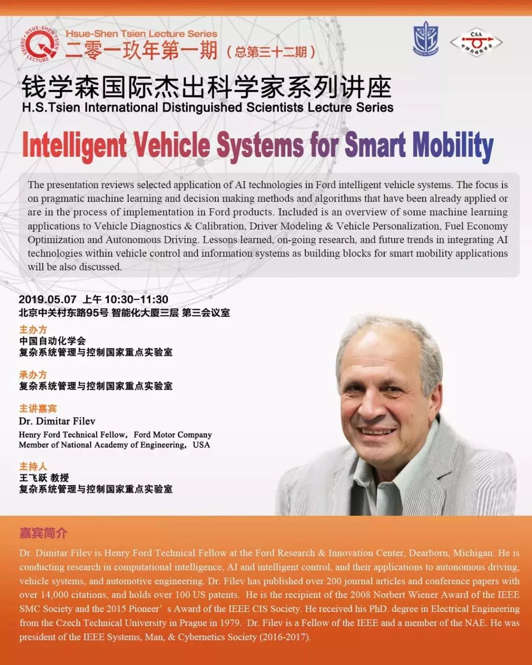 2019年第一期(总第三十二期)“钱学森国际杰出科学家系列讲座”将于5月7日在中科院自动化研究所举办。本期讲座邀请到美国福特公司创新与研发中心技术研究员Dimitar Filev博士做题为“Intelligent Vehicle Systems for Smart Mobility”的报告。报告将聚焦人工智能技术在福特智能汽车系统中的应用,重点介绍机器学习、决策方法以及算法在福特产品的生产过程中的应用,包括机器学习应用于车辆诊断和校准、驾驶建模和车辆个性化,燃油经济性优化和自动驾驶。报告还将讨论在车辆控制和信息系统中集成人工智能技术的经验教训、正在进行的研究以及作为智能移动应用构建模块的未来趋势。