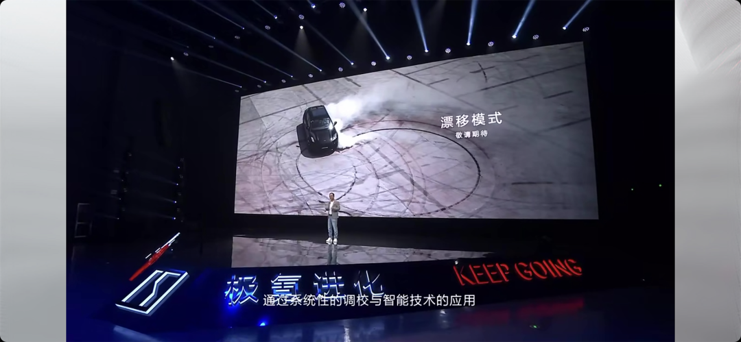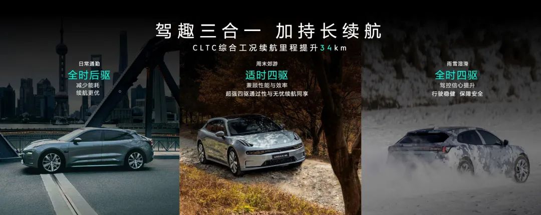 针对双电机 YOU 版本,极氪还会上线“闪电切换”功能,允许前电机完全脱开、适时介入工作,从而降低电能消耗。在 CLTC 工况下,前电机适时工作最多能延长 34km 续航。基于这两项功能,极氪还在开发针对高强度驾驶的漂移模式。
