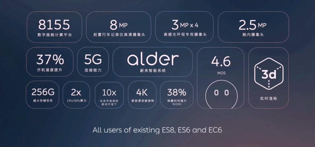 而在不久前蔚来发布 ES7 的时候,他们则选了另一条路——原版硬件的保有量实在太大了,并非所有消费者都愿意持续升级。于是,基于 Tegra X1+NT 1.0、8155+NT 1.0、8155+NT 2.0 三种硬件组合,蔚来分别推出 Aspen、Alder 和 Banyan 三套智能系统,分别进行 OTA 升级。这样就能保证每种组合的用户,都能得到硬件能力范围内的系统迭代升级。