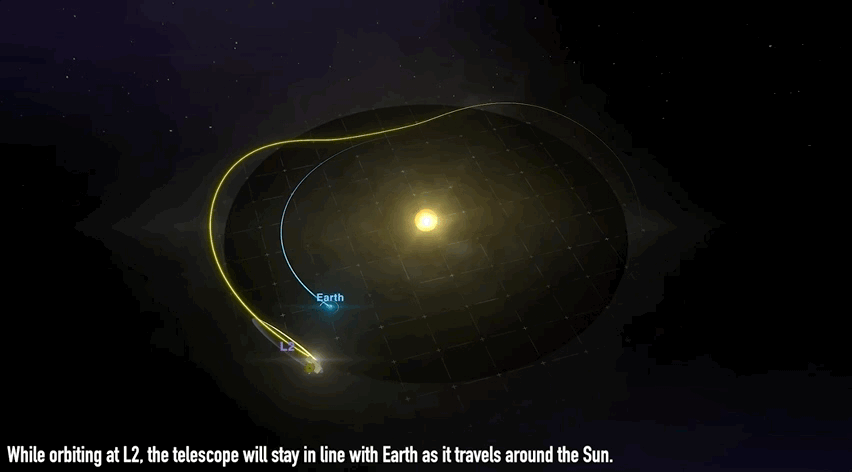 韦布望远镜的终点是距离地球140万公里远的L2拉格朗日点,在这里与地球同步绕太阳公转。