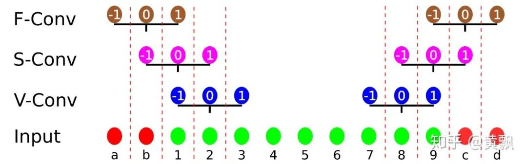 其中红色部分表示padding,绿色部分表示边界区域。很明显,valid模式下卷积核最右边的1永远无法作用于绿色部分的1,same模式下的卷积核最右边 1永远无法作用于绿色部分的1 。作者以zero-padding和circular-padding两种模式做了一个例子说明: