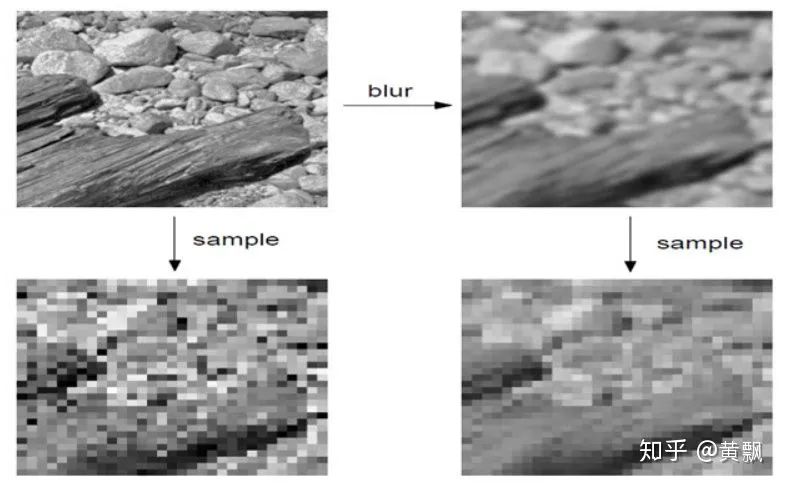 很明显,降采样对于平移相等性的影响更大,而CNN中涉及到降采样的操作有:池化(maxpooling和average pooling)和带步长的卷积(strided convolution)。对此作者提出了一种名为Anti_aliasing方法,中文叫做抗锯齿处理。传统信号处理领域中对于抗锯齿的技术,一般要么增大采样频率,但由于图像处理任务一般都需要降采样,这一点不适合。要么采用图像模糊(bluring)技术,根据Nyquist采样理论,是给定采样频率,通过降低原始信号的频率来使得信号能够被重构出来,如下图所示。对模糊化处理和未处理的原图像进行下采样,得到图中底部的两张图,模糊化处理的原图像下采样的图像还能看出一些轮廓,而未处理的原图像下采样的图像就显得更加混乱。