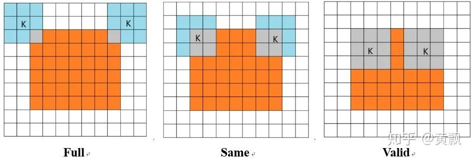 作者首先以三种卷积方式为例,full/same/valid,各自的区别在于padding的大小,具体方式我就不细说了,给个示意图: