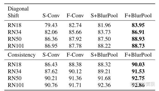 可以发现,跟之前的观察结果一样,前两种策略的泛化能力很差,而基于Circular padding和full convolution的模式效果最好。接着作者为了降低边界的影响,采用了前文介绍卷积平移不变性里面提到的blur pooling+Tri3卷积核。然后对比S-conv+circular padding和F-conv两种策略对于不同的图像对角平移的鲁棒性: