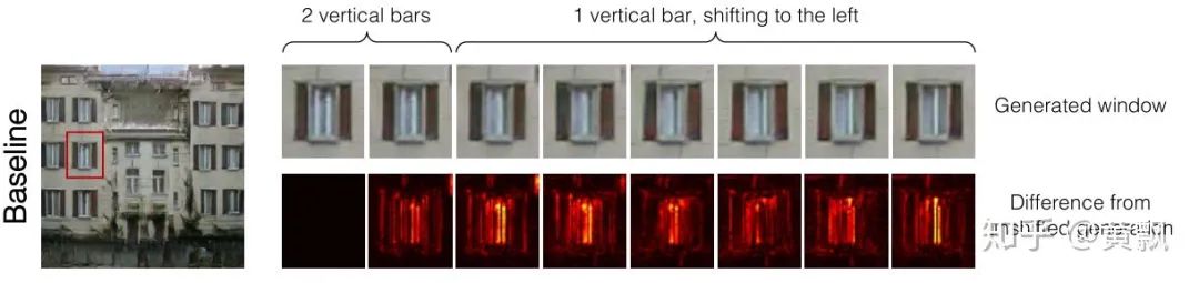 上图是对于一个窗户分别采用从0~7的平移量,其特征图与不平移的差异,可以明显看到,特征图出现了波动。相应地,上半部分是利用pix2pix生成的图像,我们可以看到随着平移量的增大,窗户中的竖直线从两根变成了一根。这一点就表明传统的CNN网络并不具有平移不变性。