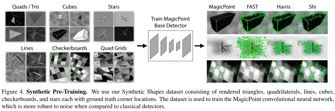 本文采用了非人工监督的方法提取真实场景的特征点。本文设计了一个由特征点检测器监督的具有伪真值数据集,而非是大量的人工标记。为了得到伪真值,本文首先在大量的虚拟数据集上训练了一个全卷积网络(FCNN),这些虚拟数据集由一些基本图形组成,例如有线段、三角形、矩形和立方体等,这些基本图形具有没有争议的特征点位置,文中称这些特征点为