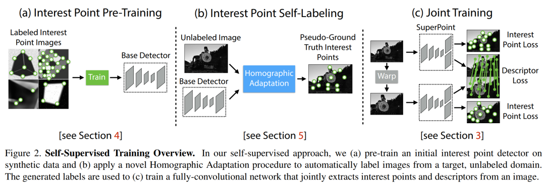 这篇文章设计了一种自监督网络框架,能够同时提取特征点的位置以及描述子。相比于patch-based方法,本文提出的算法能够在原始图像提取到像素级精度的特征点的位置及其描述子。本文提出了一种单应性适应(