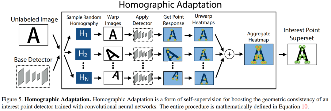 ,为了使网络的泛化能力更强,本文不仅使用原始了原始图片,而且对每张图片进行随机的旋转和缩放形成新的图片,新的图片也被用来进行识别。这一步其实就类似于训练里常用的数据增强。经过一系列的单映变换之后特征点的复检率以及普适性得以增强。值得注意的是,在实际训练时,这里采用了迭代使用单映变换的方式,例如使用优化后的特征点检测器重新进行单映变换进行训练,然后又可以得到更新后的检测器,如此迭代优化,这就是所谓的self-supervisd。