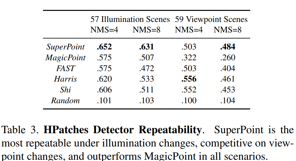 )的策略以增强特征点的复检率以及跨域的实用性(这里跨域指的是synthetic-to-real的能力,网络模型在虚拟数据集上训练完成,同样也可以在真实场景下表现优异的能力)。